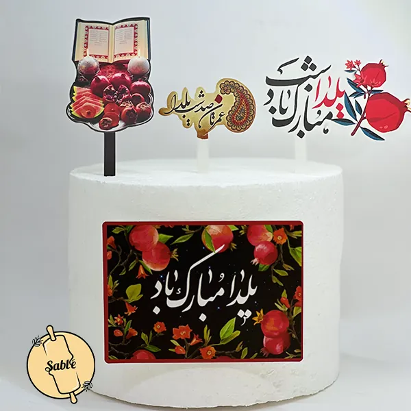 ست تاپر 4 تکه یلدایی طرح حافظ و انار، نمادی ترین المان های شب چله را روی کیک شما میاورد. این مجموعه شامل تصویر زیبای دیوان حافظ در کنار شمع و سینی میوه، تایپوگرافیهای اصیل «یلدا مبارک» و یک پلاک جلوی کیک با زمینه مشکی و گلهای اناری است. اگر میخواهید سنت «فال حافظ» و چیدمان کلاسیک سفره یلدا را در دیزاین کیک خود تداعی کنید، این طرح بهترین و سنگینترین انتخاب برای شماست.